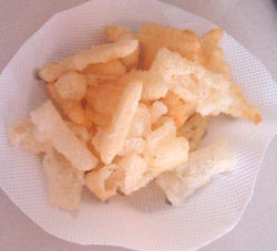 餅を適当な大きさに切って、揚げて、塩を適当にふって出来上がり。砂糖ふったのも好きだなぁ。