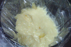 1.リンゴバターを練ってから、薄力粉を2~3回に分けて振るい入れる。その時には切るように混ぜること。