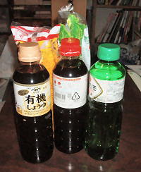 しょうゆ(2本)、サラダ油(2本)、料理酒、ここに写ってないけど、鰹節の小分けパック・・・。
