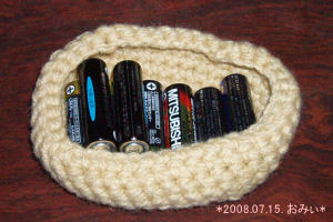 リモコン入れの中に入れる電池入れを編みました。これは、アクリル毛糸で編んであります。入れるとこんな感じです。