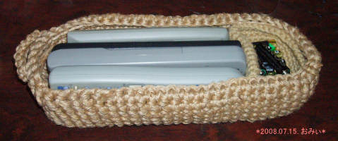 麻ひもで編んだリモコン入れです。大きさは、27cm×15cmくらいです。 取り出しやすいように、取っ手をつけてあります。歪んでいるのは、うっかり増やし目してしまったせいです。でも、家用なので直さずに編み続けました。